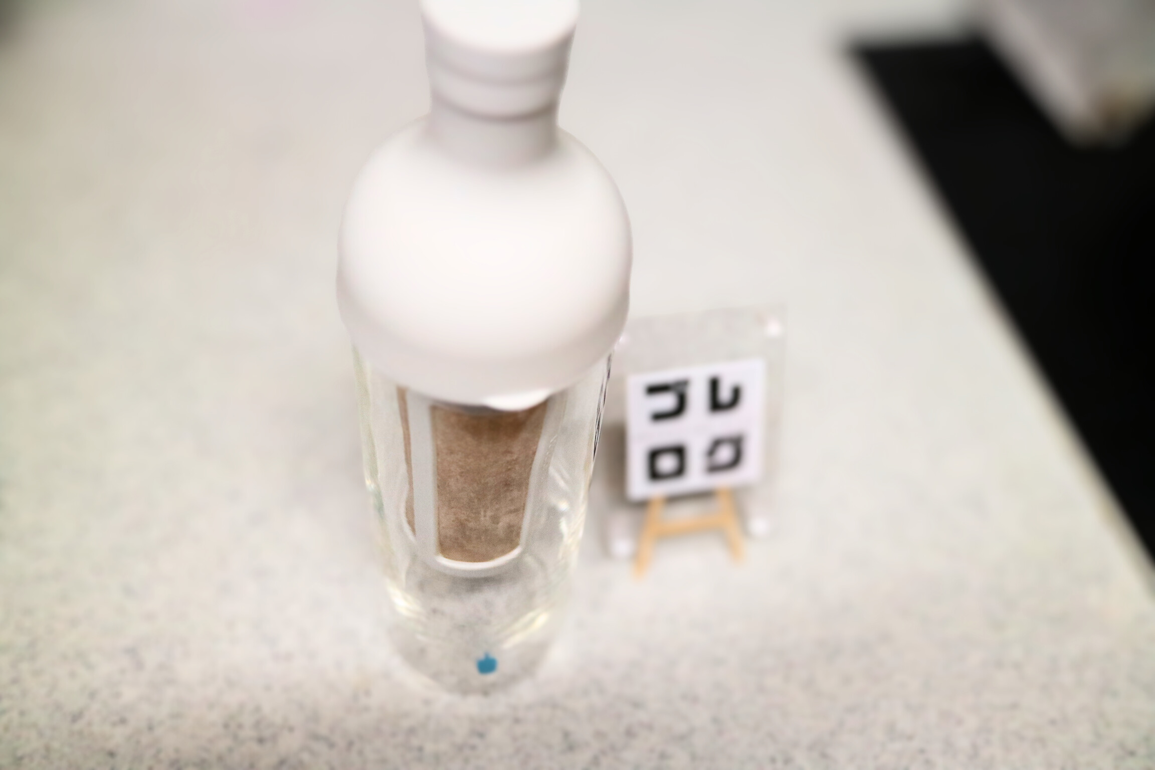 シリコン製のキャップと上蓋、ガラス製の本体、プラスチック製のストレーナーの構成です。