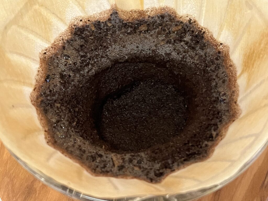 コーヒー豆全体にお湯が掛かるように縁を描きながら注ぎます