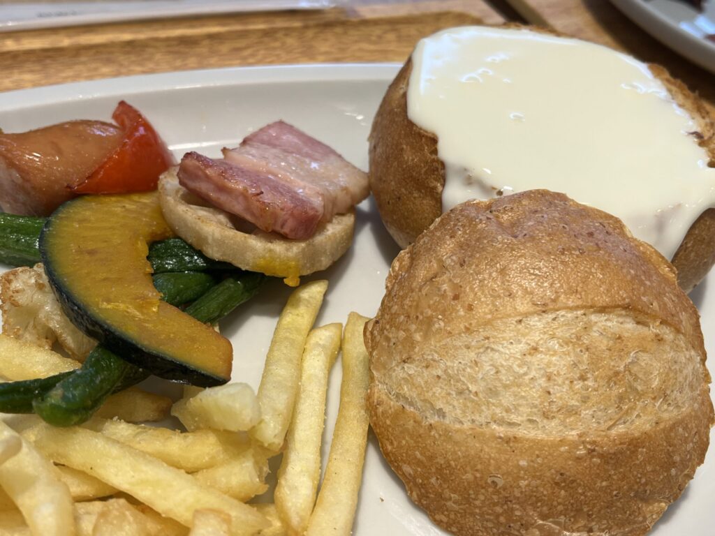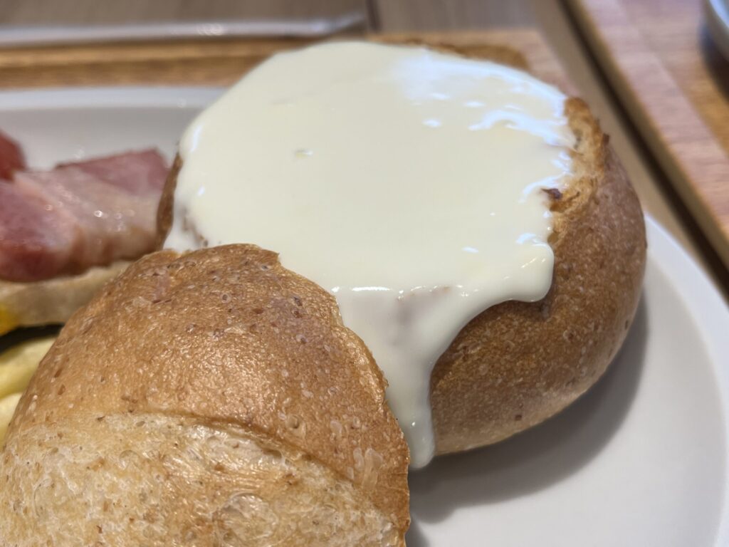 パンの器にチーズがたっぷりと入っており、ベーコンやソーセージ、野菜、ポテトをチーズに付けていただきます。