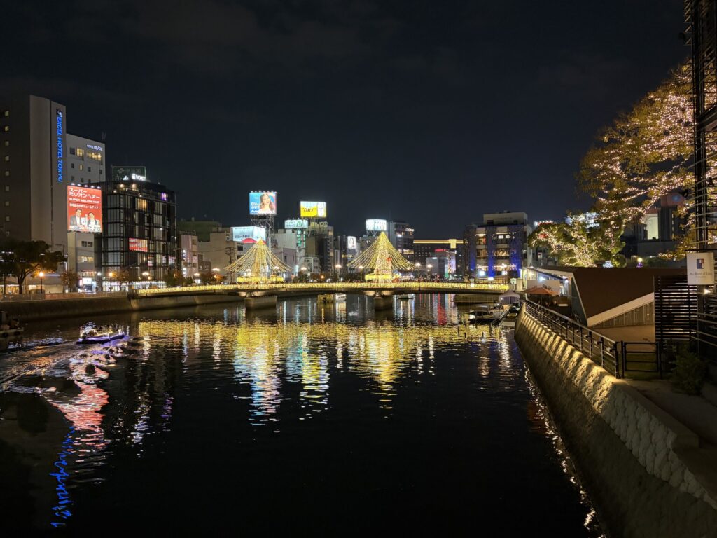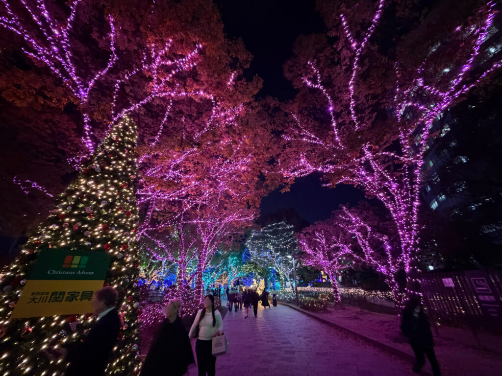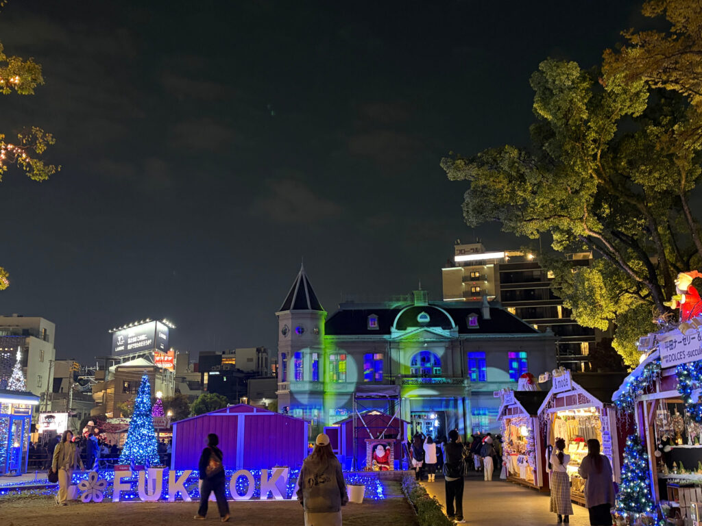 途中、「天神中央公園」ではイルミネーションが点灯しており、