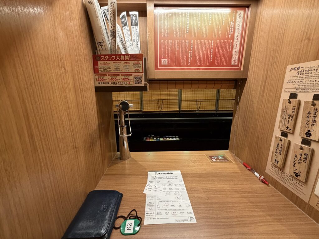 行列待ちの間に紙を渡され、麺の硬さやスープの濃さ、ネギの種類や秘伝のタレの量等記入して待ちます。