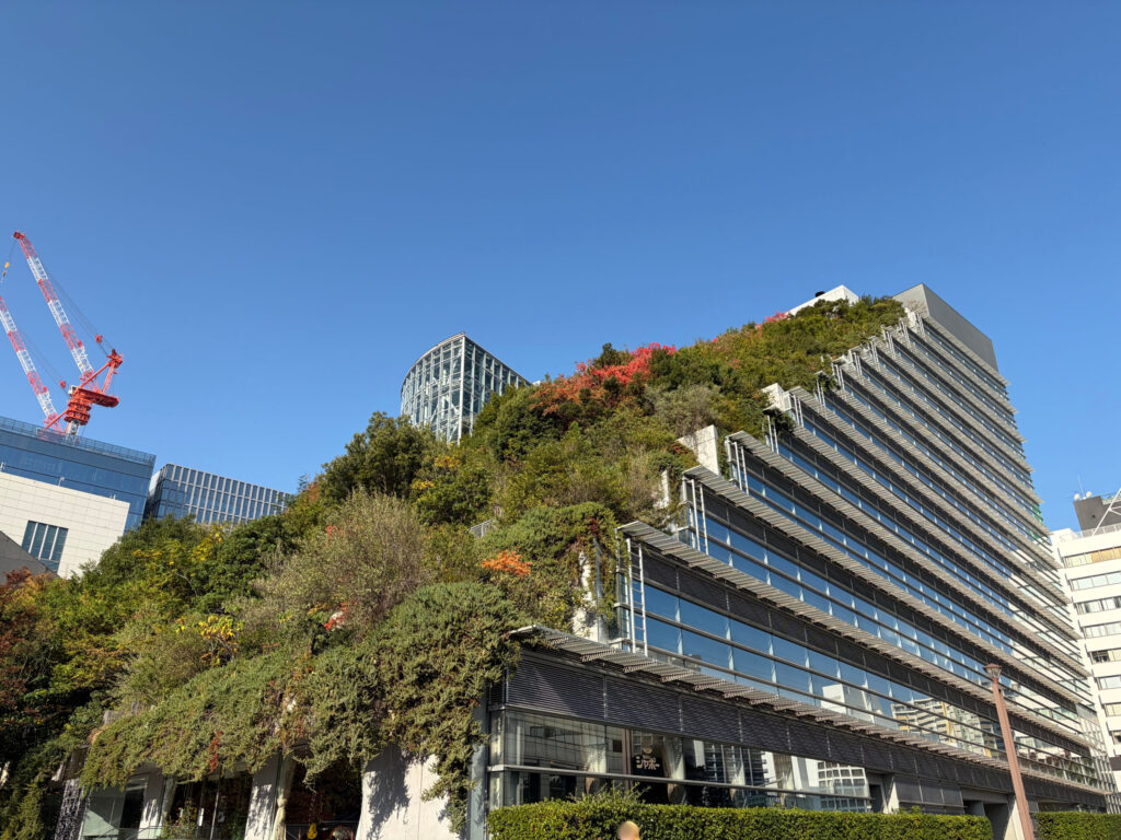 木々の緑が印象的な外観から一歩中へ足を踏み入れると、そこは光の空間。ステップ状の個性的な建物のフォルムを活かして、ホールやイベント会場、店舗やオフィスなどのさまざまな施設が点在しています。